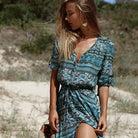 هذا الفستان الطويل يتميز بقصة على شكل حرف V وأكمام طويلة، مما يخلق قوامًا سلسًا وأنثويًا. طباعته الملونة المستوحاة من الأزتيك تضيف لمسة من الأصالة مع الحفاظ على الرقة. مثالي لحفل، يجمع بين الراحة والرقي بشكل مثالي.