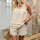 This sleeveless V-neck set combines comfort and elegance with a flowing cut. Ideal for summer days, it offers a relaxed and stylish look with complete simplicity.