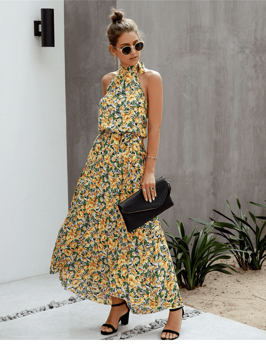Tämä pitkä boheemimekko viehättää kirkkaalla kukkakuviollaan ja hienolla solmittavalla kauluksellaan. Sen virtaava leikkaus korostaa siluettia hienovaraisesti samalla kun se tarjoaa täydellistä mukavuutta kuumina päivinä. Täydellinen kesäretkelle tai kaupunkikävelylle.