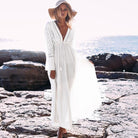 השמלה הלבנה הארוכה הזו מציעה חיתוך זורם ורחב לנוחות אופטימלית. הצווארון העמוק שלה והפרטים בתפירה מוסיפים נופך של נשיות. מושלמת לערבי קיץ, היא מתאימה לכל הזדמנות.