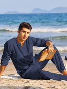 סט זה לגברים משלב סגנון ורווחה. מורכב מכנסיים וחולצה, הוא אידיאלי לימים שטופי שמש.