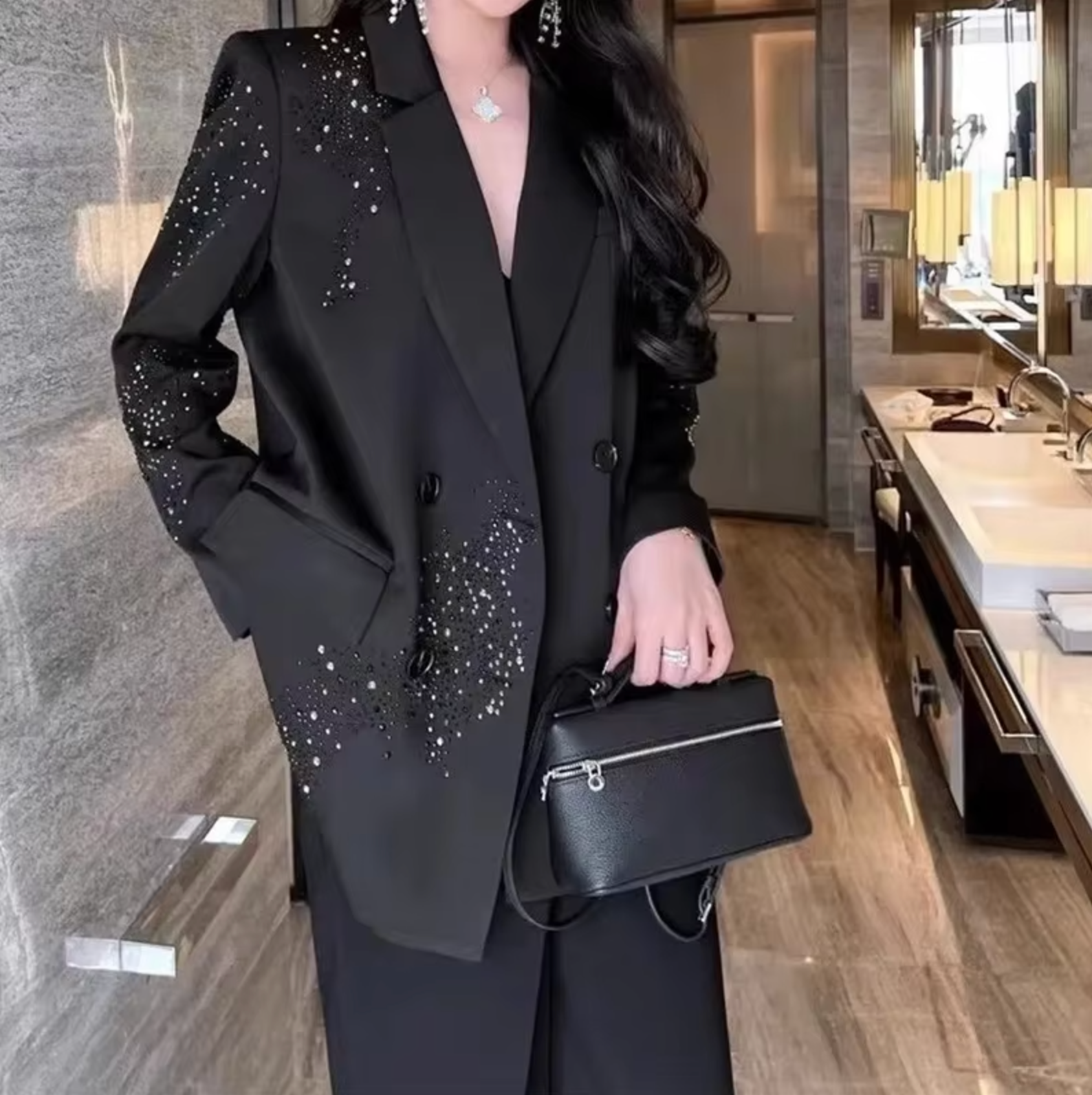 הז'קט השחור הזה מגלם את האלגנטיות המודרנית עם נגיעה של ברק עדין. הפרטים המנצנצים שלו מוסיפים נופך מעודן למראה שלכם, מבלי להיראות מוגזם. מושלם לערב אלגנטי או למראה מקצועי מהודר, הוא משלב בין צניעות לזוהר.