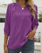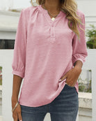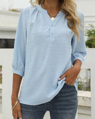 Questa blusa classica unisce un taglio senza tempo a un tocco moderno. Il suo colletto a fessura con bottoni aggiunge stile, mentre le maniche leggermente arricciate conferiscono un tocco femminile. Perfetta per un look curato e confortevole ogni giorno.