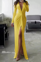 Questo abito lungo seduce con il suo scollo a V elegante e la sua plissettatura raffinata a livello del busto. La sua linea fluida abbraccia le curve senza costringere, offrendo comfort e stile. Una scelta ideale per brillare durante i tuoi eventi più significativi.