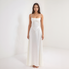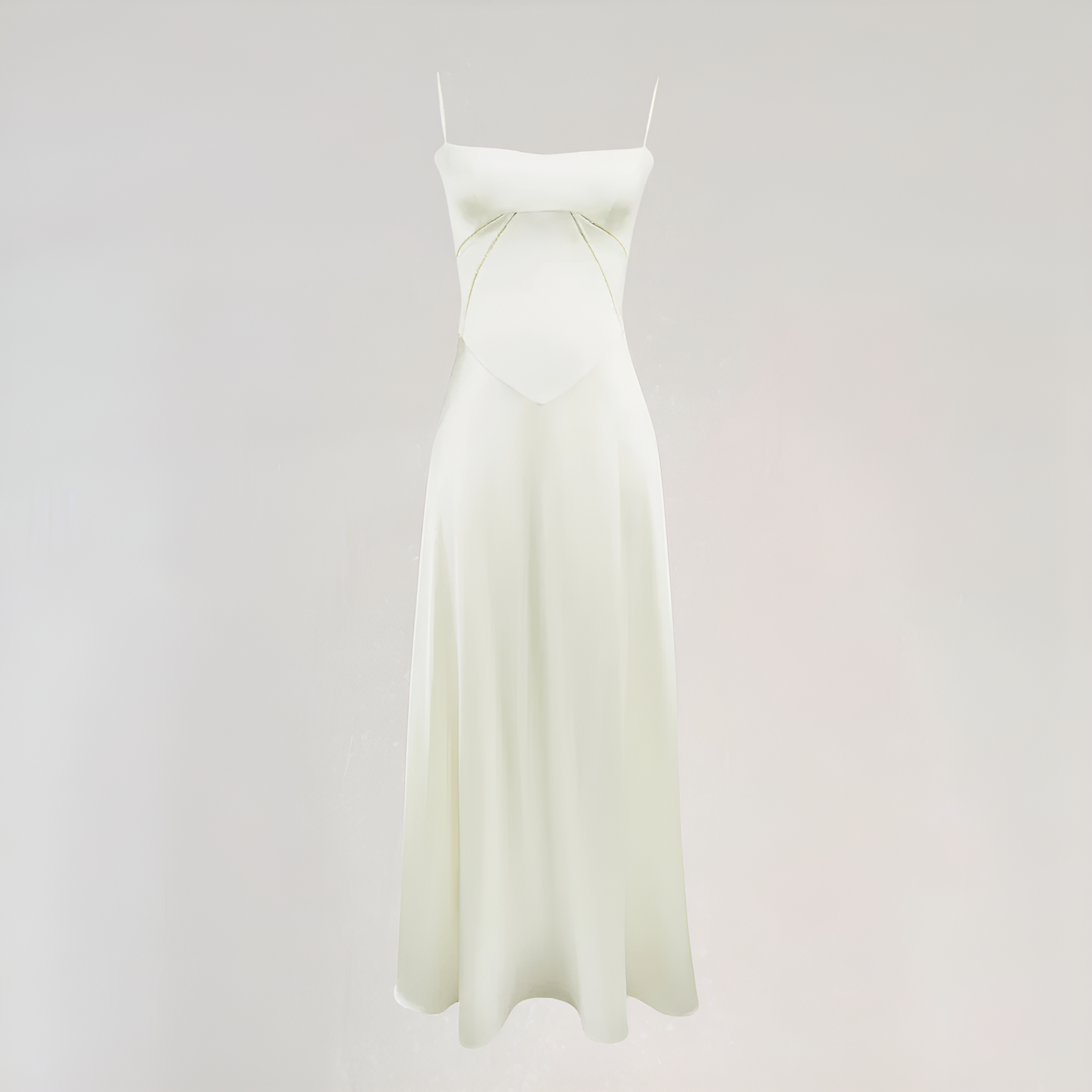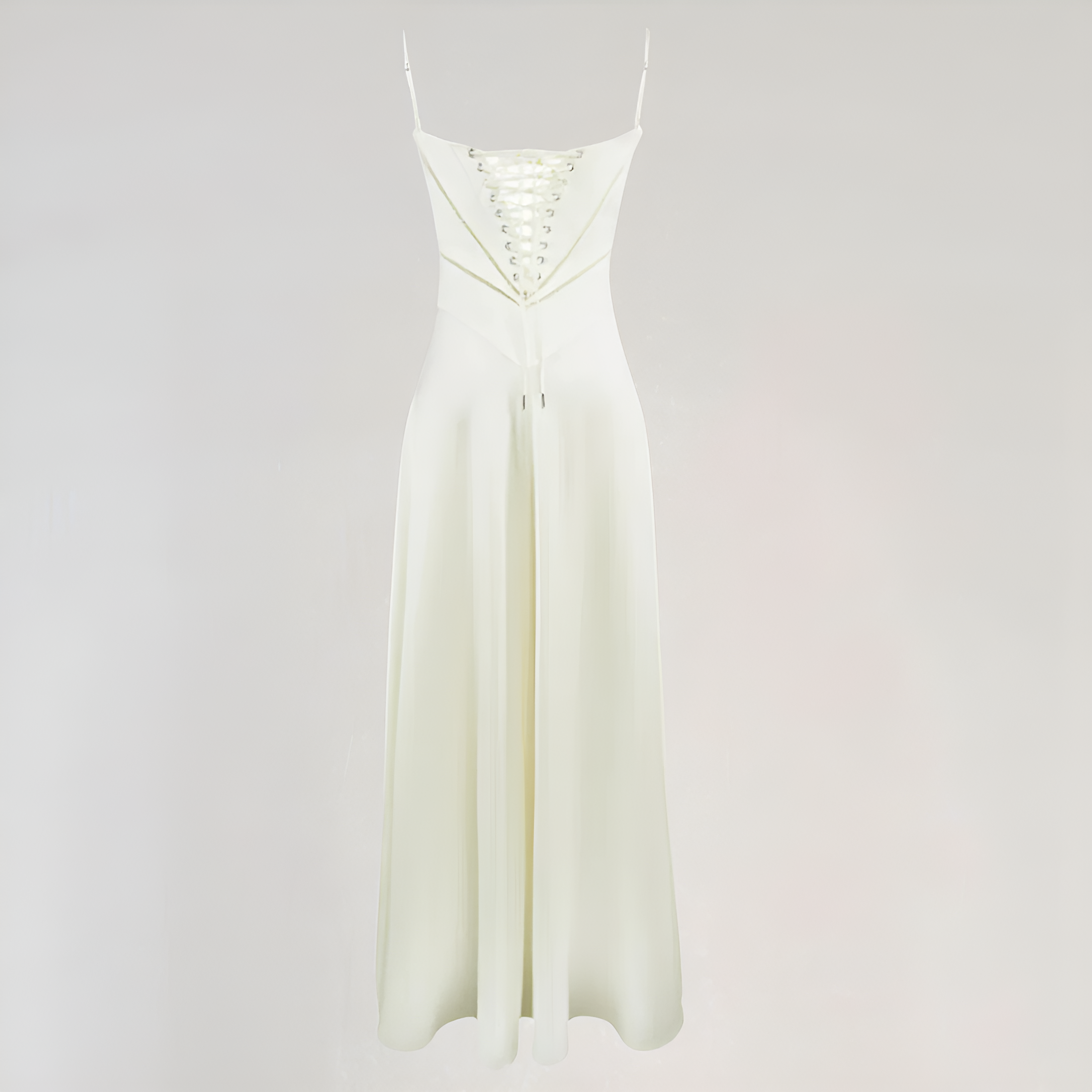 このロングドレスは、コルセット風のコルセットがウエストを繊細に強調し、シルエットを引き立てます。流れるようなカットが動きと優雅さをもたらし、コルセットの背中がロマンティックで構造的なタッチを加えます。夜のイベント、ガラ、またはセレモニーに最適です。