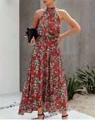 このボヘミアンシックスタイルのロングドレスは、花柄と流れるようなカットを特徴としています。背中の留め具付きの高い襟が、肩を優雅に見せます。