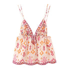 このノースリーブブラウスは、アステカアートにインスパイアされたデザインと鮮やかな色合いで魅了します。軽やかで流れるような着心地で、快適さとカジュアルスタイルを兼ね備えた、晴れた日のための完璧なアイテムです。