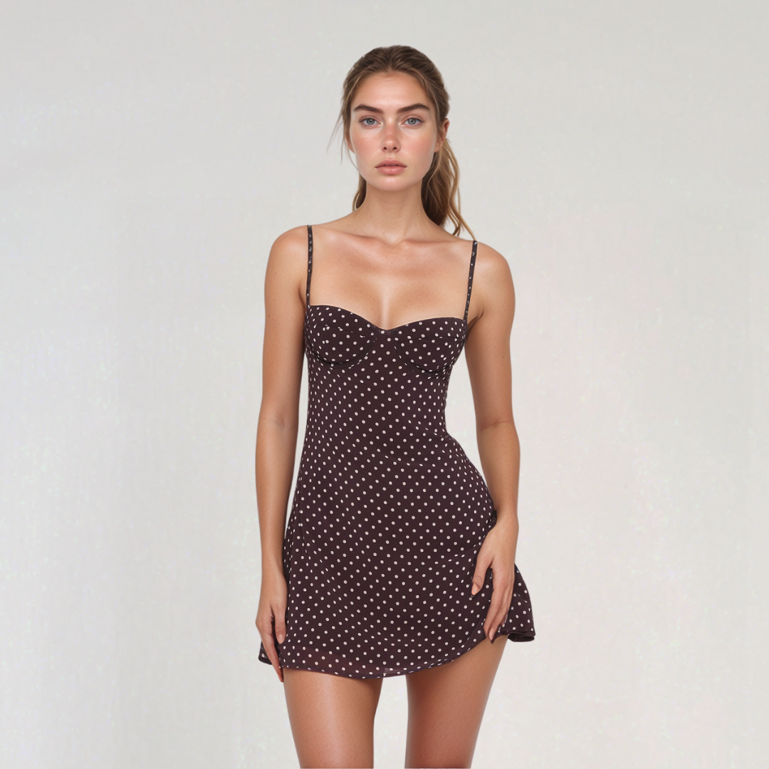 このショートドレスは、女性らしいカット、細いストラップ、ハート型のネックラインで魅了します。チョコレート色の背景にドット柄がレトロでエレガントな印象を与えます。晴れた日や夏の夜に輝くのに最適です。