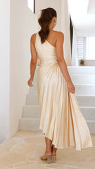 このロングイブニングドレスは、片方のストラップの大胆なカットと繊細なプリーツ生地で魅了します。フィット感のあるウエストがエレガントにシルエットを引き立て、一方で流れるような仕上げが洗練された印象を与えます。正式なイベントや特別な夜のために輝くのに最適です。