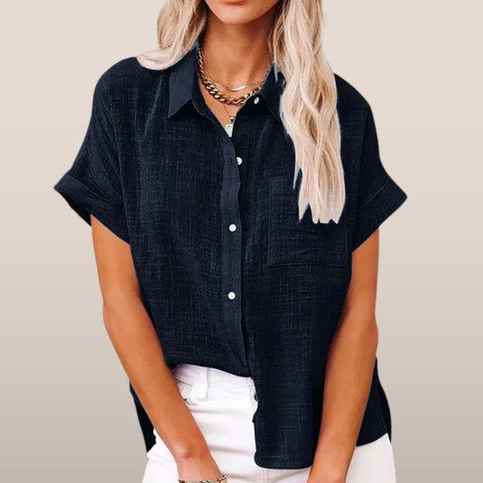 Denne blusen har en romslig passform som er ideell for varme dager. Den klassiske kragen og knappestolpen gir et elegant preg. Perfekt for en uformell eller profesjonell look.