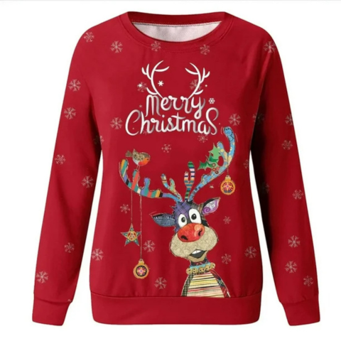 Deze trui toont een vrolijk en kleurrijk geïllustreerde rendier. De sneeuwvlokken en versieringen voegen een visuele toets toe die de warme geest van het seizoen oproept. Gemakkelijk te dragen in het dagelijks leven, voegt hij een speelse noot toe aan elke eindejaarsoutfit.