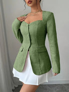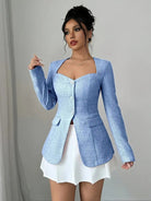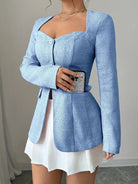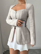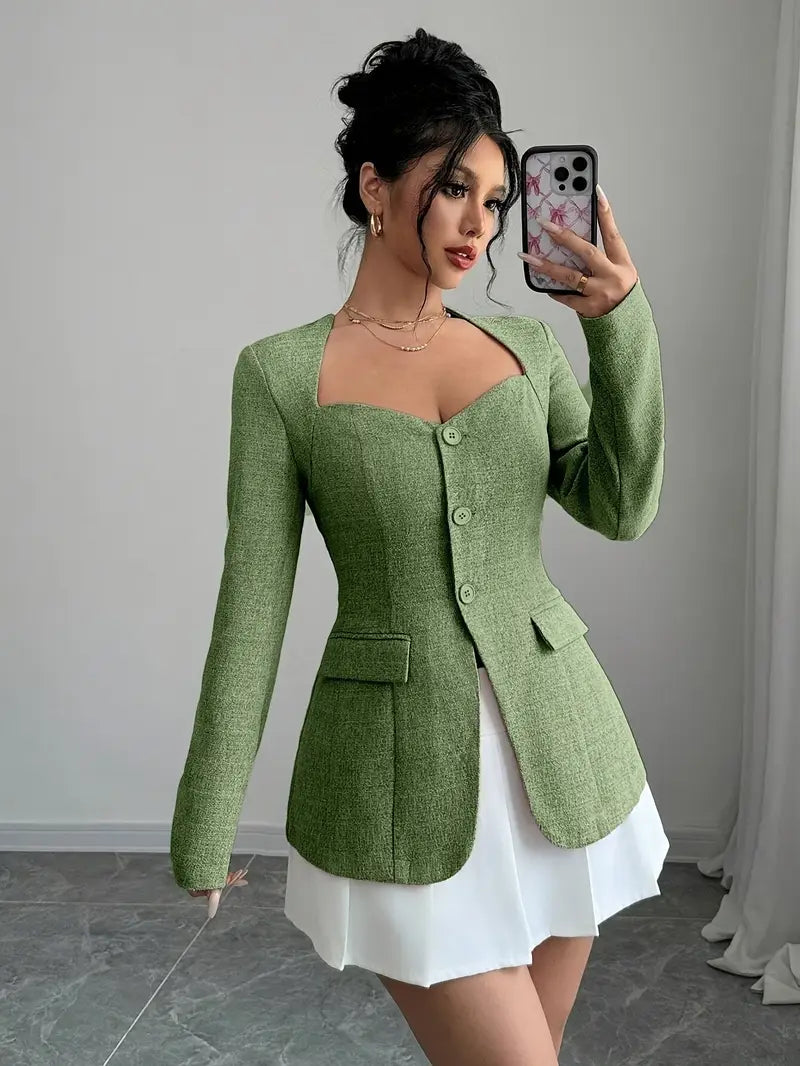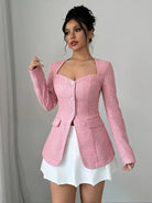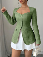 Ta zapinana kurtka podkreśla sylwetkę dzięki dopasowanemu krojowi i nowoczesnemu kwadratowemu dekoltowi. Idealna na elegancki i kobiecy wygląd, sprawdzi się zarówno w biurze, jak i na wyjściu. Jej staranny design i delikatne guziki dodają ponadczasowego szyku twojej stylizacji.